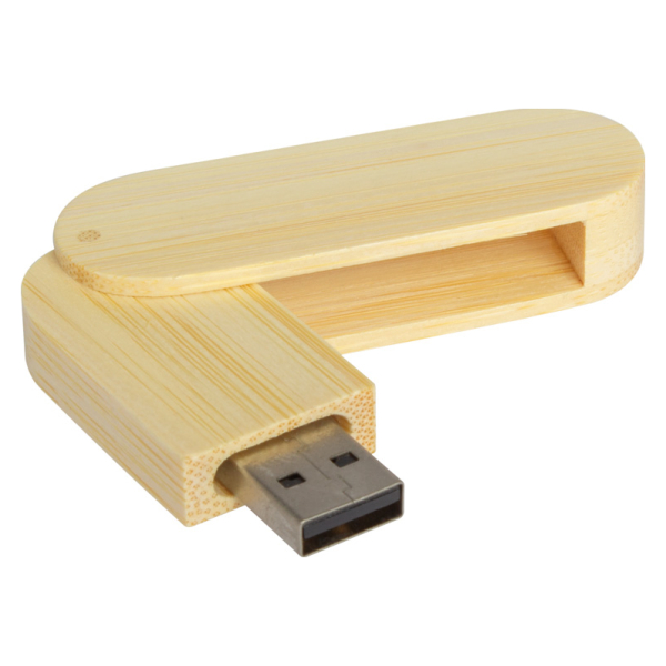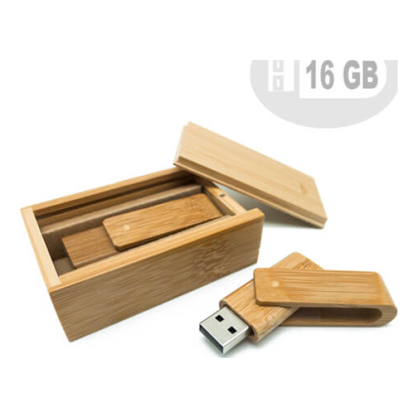 Pendrive giratorio de madera de bambú. Capacidad de 16 GB. Presentado en elegante estuche también de madera de bambú.