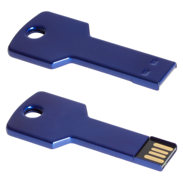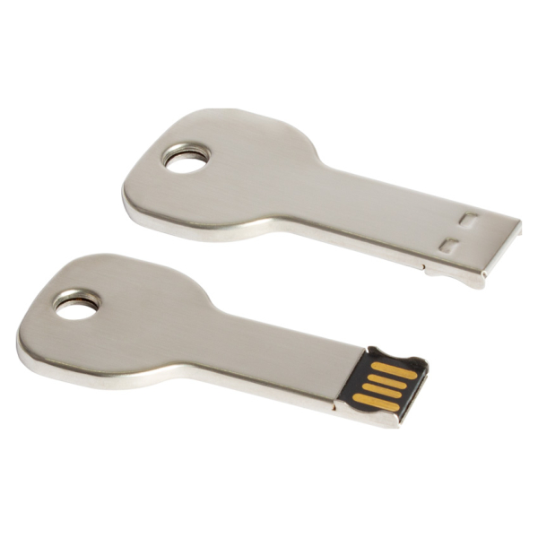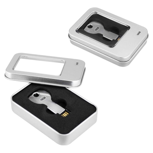 USB Pen Drive 2.0 con 16GB de capacidad, con forma de llave metálica. Ideal para llevar en tu llavero personal. Presentación en caja metálica pequeña con ventana.