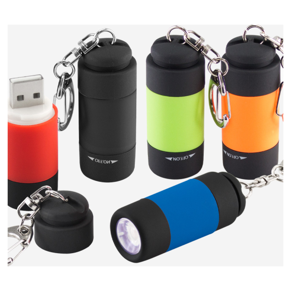 Llavero-Linterna LED con terminal USB para recarga (Batería recargable). Elegante cuerpo de silicona negro/color. Presentación en Estuche de Regalo plateado. Tamaño: Ø 2.1 x 5.3 cm.Producto agregado con éxito a la lista de cotizaciones