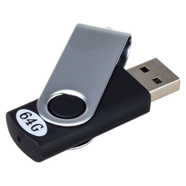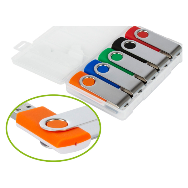 Set de 5 USB Pendrive 2.0 de 64GB de memoria cada Pendrive, con carcasa metálica de giro. Cada Pendrive tiene la particularidad de venir con cuerpo plástico bicolor: por un lado un color blanco común para todos los Pendrive, y por el otro, cuerpo de color Presentación en Estuche de PVC translúcido de regalo.Producto agregado con éxito a la lista de cotizaciones