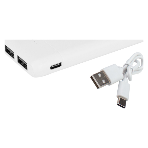 Cargador Power Bank USB portátil plástico ABS blanco, con indicador de carga y doble salida USB. Capacidad 5000mAh. Entrada DC 5V/2A, salida DC 5V/2A. Incluye cable USB/Type C. Batería recargable incorporada. Presentación en caja de regalo de cartulina blanca con colgador para ganchera .Tamaño: 5 x 10 x 1.2 cm / Caja 7 x 12.2 x 2.8 cmProducto agregado con éxito a la lista de cotizaciones