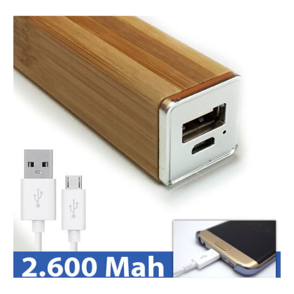 Batería externa de madera de bambú y aplicaciones metálicas. Capacidad de 2.600 mAh. Presentado en estuche de cartón reciclado duro. Incluye cable de carga USB/micro USB.Producto agregado con éxito a la lista de cotizaciones
