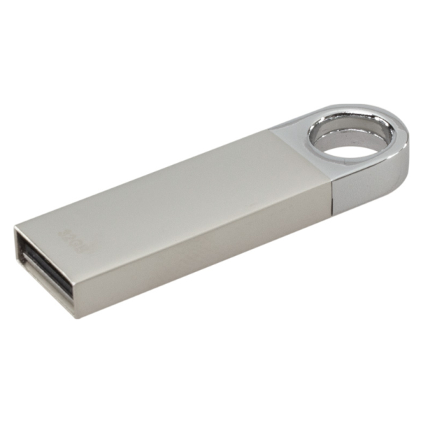 Mini-Pendrive USB 2.0 con 32GB de memoria, cuerpo metálico y espacio redondo para colgar. Presentación en práctico blister de cartón reciclado con ranura para ganchera, y estuche plástico translúcido para remover el pendrive directamente.