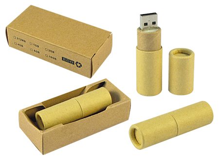 USB Pendrive 2.0 cilíndrico de 64GB de capacidad, 100% en cartón . Presentación en estuche de cartulina.