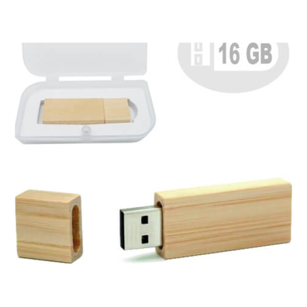 Pendrive rectangular de madera bambú. Capacidad de 16 GB. Presentado en estuche plástico de PVC traslúcido con interior acolchado blanco.Producto agregado con éxito a la lista de cotizaciones