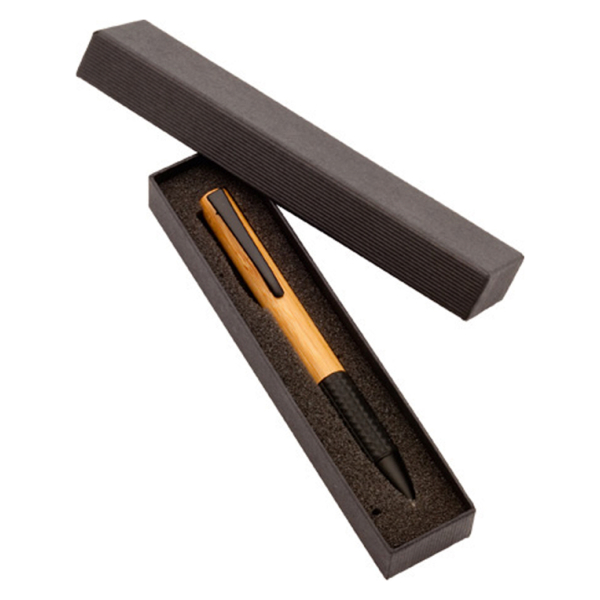 Bolígrafo Ejecutivo Bamboo Bolígrafo Ejecutivo de Madera de Bambú, con terminales negro opaco. Refill plástico parker type. Escritura azul. Presentación individual en Estuche de Cartón plisado negro.