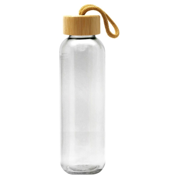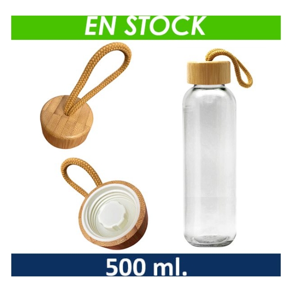 Botella de vidrio con tapa rosca de bambú y cinta de cordón trenzado. Capacidad de 500ml.Incluye silicona antiderrame. Presentación en plástico burbuja dentro de caja de cartón negra. Caja de 40 unidades.