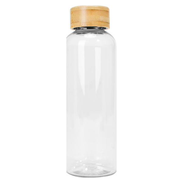 Botella plástica PET color translúcido, con tapa redonda twist-off de Bamboo, modelo «AINOA». Producto BPA FREE, para el contacto con líquidos y alimentos. Capacidad 550ml. Presentación en bolsa OPP + caja de regalo de cartón kraft. D6.6 x H20 cm.