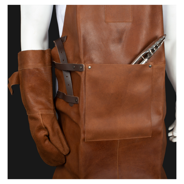 Un regalo fuera de serie. Deluxe set de Asador, contiene Pechera de Asador BBQ en Cuero tostado 100% genuino color café cognac, con cintas y porta-accesorios de Cuero 100% genuino color café oscuro. Remaches de acero envejecido y bolsillo delantero de 20.5 x 23 cm. Cuadrado para logo de 8 x 8 cm. Contiene además largo mitón de Asador BBQ en Cuero engamuzado 100% genuino color café cognac y tenazas de Acero inoxidable. Presentación en elegante caja de regalo de cartón negro con ventana de mica transparente y gráfica a todo color con descripción de los elementos del set.
