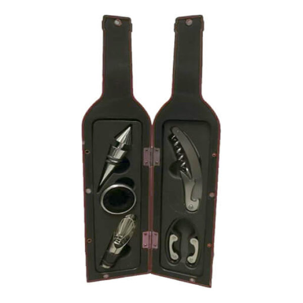 Set de vino en botella plástica que incluye sacacorchos, anillo de vino, vertedor de vino, tapón para vino, cortador de láminas. Presentación en caja de cartón duro negra. Sacacorchos (acero inoxidable). Anillo de vino (acero inoxidable). Vertedor de vino (acero inoxidable). Tapón de vino (aleación de zinc, cromado). Cortador de láminas (ABS + acero inoxidable). Caja superior roja en forma de botella (ABS) en brilloProducto agregado con éxito a la lista de cotizaciones