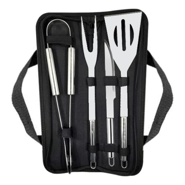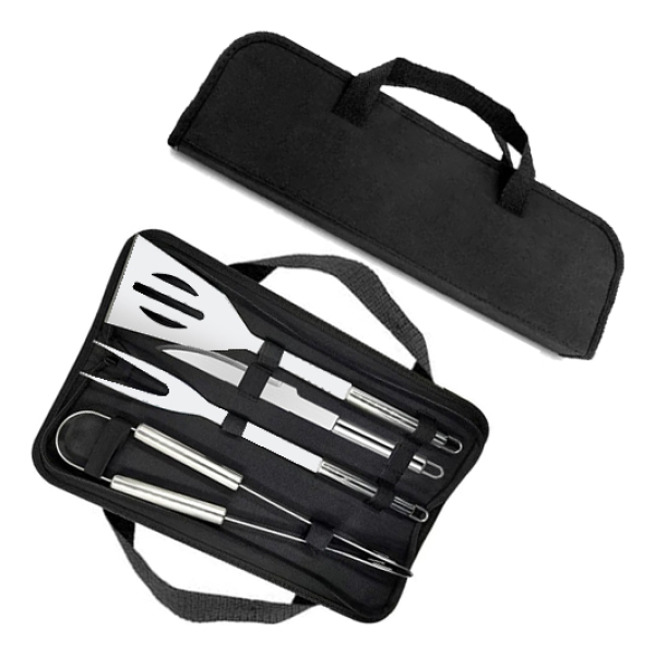 Set parrillero BBQ que incluye espátula, cuchillo parrillero, pinzas y tenazas. Presentado en estuche funda de poliéster 600D con cierre metálico. 1 Espátula Parrillera. 35 cm. 1 Pincho Parrillero. 35 cm. 1 Cuchillo Parrillero. 32,5 cm.1 Tenaza Parrillera. 34 cm. Material: Empuñadura en SS 410 / Otras partes SS 420 1,5 mm. Dimensiones: Abierto: 38,5 x 24,5 cm. Cerrado: 38,5 x 12 cm.Producto agregado con éxito a la lista de cotizaciones