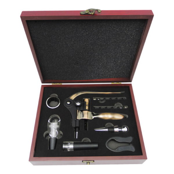 Set de vino deluxe en caja de madera color Caoba que incluye sacacorchos, anillo de vino, vertedor de vino, bomba de vacio, tapón de vino, cortador de láminas, espiral de repuesto. Presentación en caja de cartón duro negra. Sacacorchos (aleación de zinc + ABS, chapado en cobre) Anillo de vino (acero inoxidable) Vertedor de vino (silicona AS) Bomba de vacío (silicona AS) Cortador de láminas (ABS + acero inoxidable) Tapón de vino (aleación de zinc, cromado) Espiral de repuesto (acero inoxidable)Producto agregado con éxito a la lista de cotizaciones