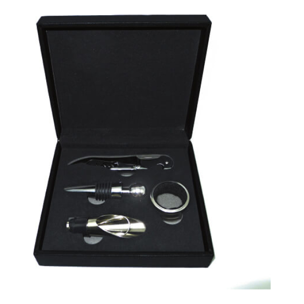 Set de vino en estuche símil cuero que incluye sacacorchos, argolla anti-goteo, tapón para vino y vertedor de vino. Presentación en caja de cartón duro negra. Sacacorchos (acero inoxidable). Anillo de vino (acero inoxidable). Tapón de vino (aleación de zinc, cromado). Vertedor de vino (acero inoxidable).Producto agregado con éxito a la lista de cotizaciones