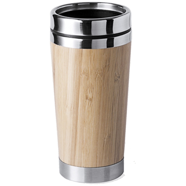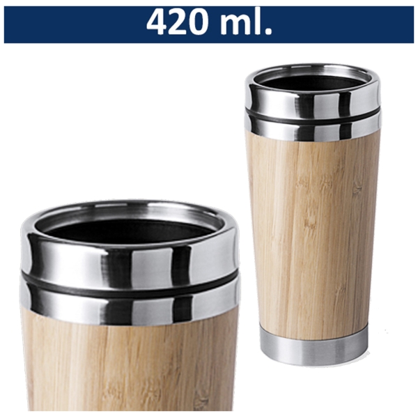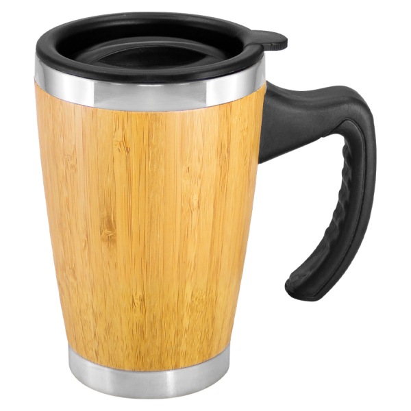 Mug de madera de Bamboo con asa plástica negra, interior de Acero Inoxidable. Tapa plástica negra con dosificador. Presentación en caja de cartón forrado natural.