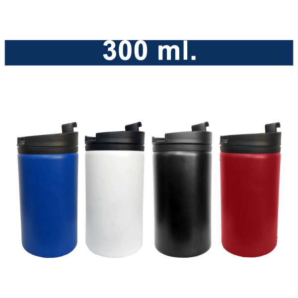 Atractivo mug de doble pared de acero inoxidable, tapón de rosca anti derrame de plástico transparente. Acabado mate. Presentación caja individual color Kraft Doble pared aislante, tapa rosca con dosificador, incluye silicona antiderrame. 350 ml. No usar con bebidas carbonatadas.