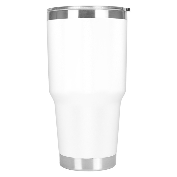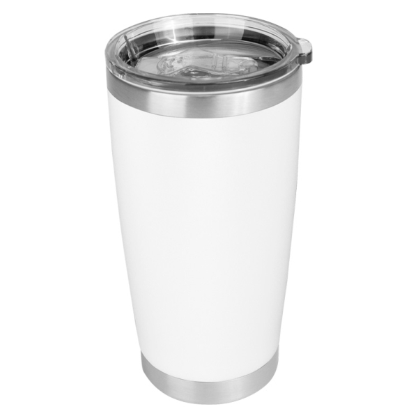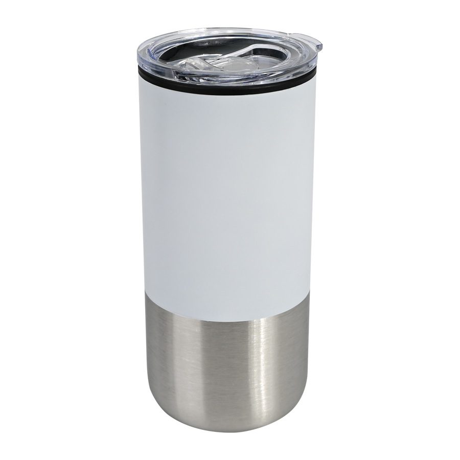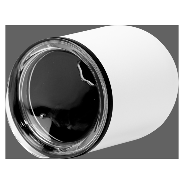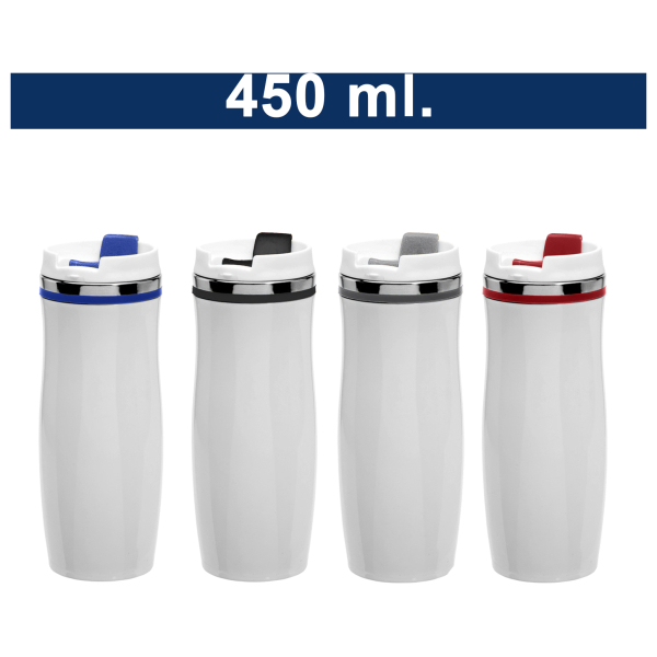 Mug metálico de cuerpo blanco. Detalle en tapa y argolla en gollete del mismo color. Exterior de acero inoxidable SS 201 e interior de acero inoxidable SS 304. Base antideslizante. Acabado matte. Capacidad de 450 ml. Presentación en caja negra. Ø 7.5 x 19,8 cm. Capacidad 450 ml. Acero inoxidable. Mug doble pared. Interior de acero 304 y exterior de acero 201. Banda de Silicona Antiderrame. Mantiene las bebidas frías o calientes por más tiempo.