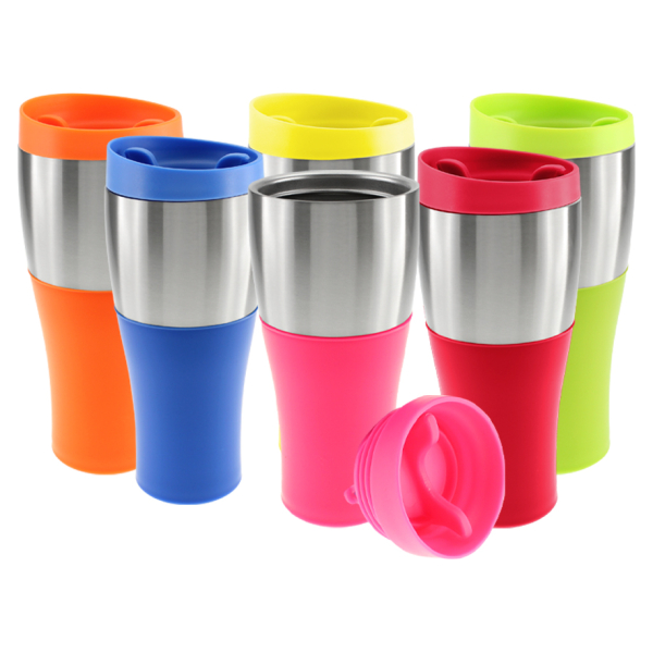 Coffee Mug grande de 470 ml plástico «PP-FRESH», tapa rosca y banda de Acero Inoxidable ideal para imprimir logos. Presentación en caja de cartón plateado.Ø 8.1 x 20.2 cm.