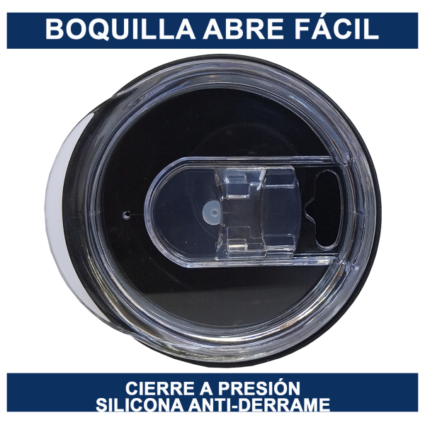 Atractivo mug de acero inoxidable, interior acero inoxidable, tapón de rosca anti derrame de plástico transparente. Presentación caja individual color Negra Doble pared aislante, tapa rosca con dosificador, incluye bombilla 900 ml. No usar con bebidas carbonatadas.