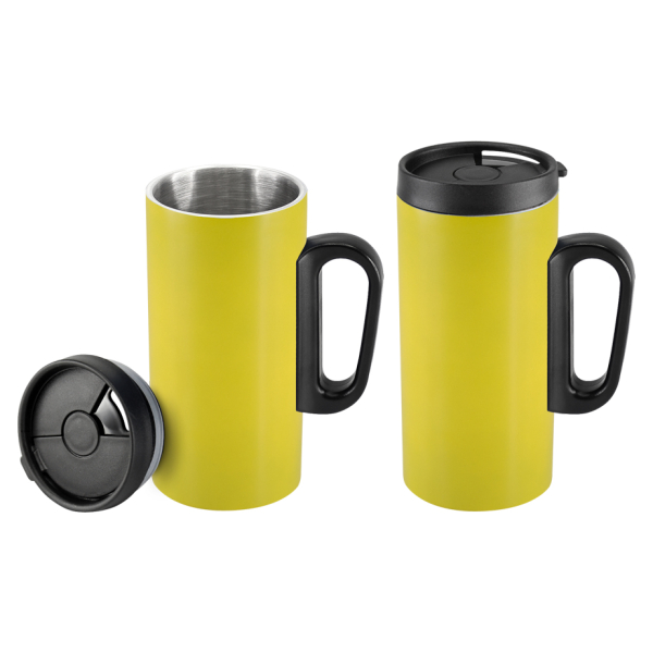 Mug térmico metálico doble pared aislante, cubierta de Polipropileno (PP) acabado mate, interior Acero inoxidable 304 SS, exterior Acero inoxidable 201 SS, modelo «MID». Producto BPA FREE, para el contacto con líquidos y alimentos. Tapa removible de plástico PET Cristal Clear con sello cilíndrico de silicona y sistema de cierre/apertura antiderrame. Capacidad 600ml. Presentación en bolsa burbuja + caja de regalo de cartón laminado negro.