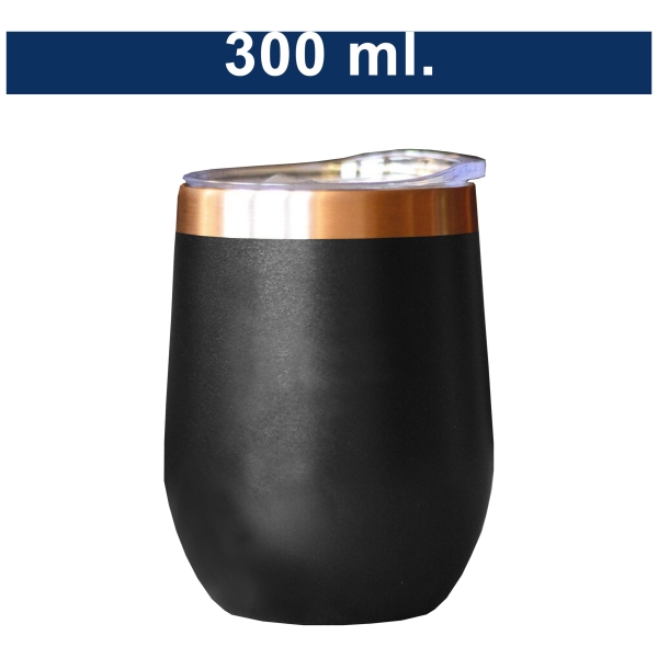 Atractivo mug metálico negro con borde color cobre. Tapón de rosca anti derrame de plástico transparente. Interior y exterior de acero inoxidable SS 201. Base antideslizante. En caja individual negra. Capacidad 300 ml.Tamaño: Ø8,8 cms. x 11,8 cms.