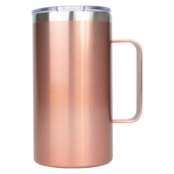 Mug metálico color cobre electro-plateado. Presentación en bolsa plástica dentro de caja de cartón negra. 600 ml. Interior y tapa de plástico. Incluye silicona antiderrame.