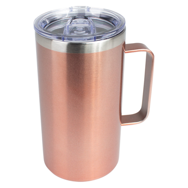 Mug metálico doble pared aislante, asa y cubierta lisa en acabado color cobre, interior Acero inoxidable 304 SS, exterior Acero inoxidable 201 SS. Producto BPA FREE, para el contacto con líquidos y alimentos. Tapa removible de plástico PET Cristal Clear con sello cilíndrico de silicona y sistema de cierre/apertura antiderrame. Capacidad 700ml. Presentación en bolsa burbuja + caja de regalo de cartón laminado negro. Tamaño: D8.7 x H18.5 cm.Regalar un mug metálico color cobre como promocional transmite calidad, exclusividad y un toque moderno/artesanal, mejorando la imagen de marca, fidelizando clientes y ofreciendo un producto útil y memorable, a menudo con interior de acero inoxidable para durabilidad y beneficios antimicrobianos inherentes al cobre.El cobre evoca lujo, calidad y distinción, asociando tu marca con la excelencia y el buen gusto.
