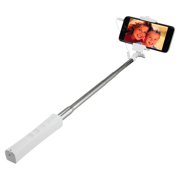 Palo extensible para Selfie «Monopod». Largo alcance de 150cm. con tu brazo extendido. Extensión total selfie-stick desplegado: 95cm. Cerrado: 30cm. Mango plástico blanco con buen área de impresión. Contiene cable de conexión y botón de disparo. No requiere aplicaciones extras para disparo.Tamaño: Desplegado: 95 x 2.5 x 2.5 cm / Cerrado: 30 x 2.5 x 2.5 cm.Producto agregado con éxito a la lista de cotizaciones