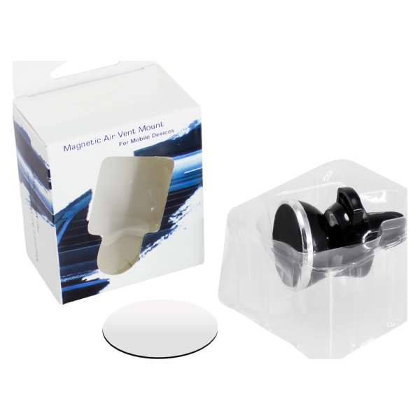 Porta-Celular magnético, con soporte para rejilla de ventilador del vehículo. Contiene placa redonda metálica con adhesivo posterior, para pegar a los celulares (más antiguos) que no cuentan con material magnético built-in. Esta placa redonda se puede grabar, previamente a ser pegada en el celular.Tamaño: 5 x 3.5 cm / Placa redonda Ø 3.5 cm.Producto agregado con éxito a la lista de cotizaciones