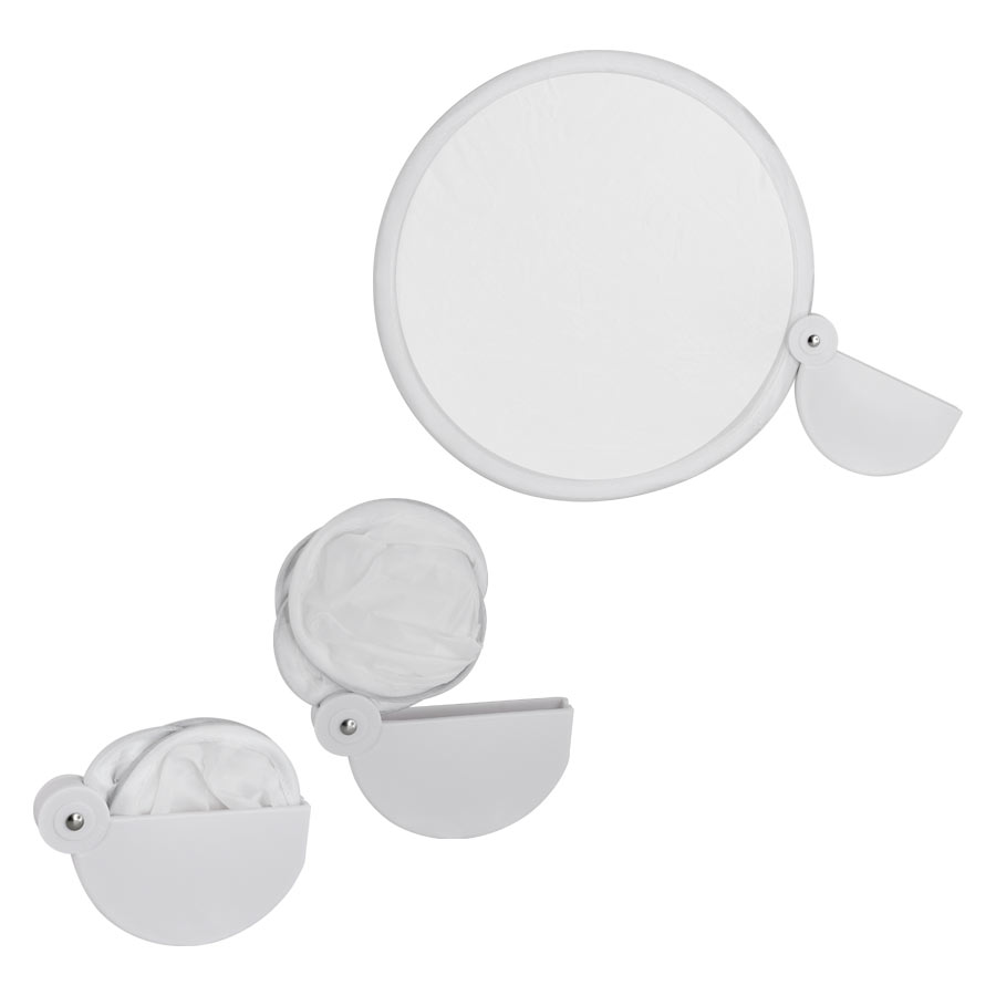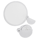 Abanico plegable de poliéster. Se guarda plegado en base semi-circular de plástico ABS. Simple, económico y fácil de imprimir o sublimar, ideal para promociones de verano.