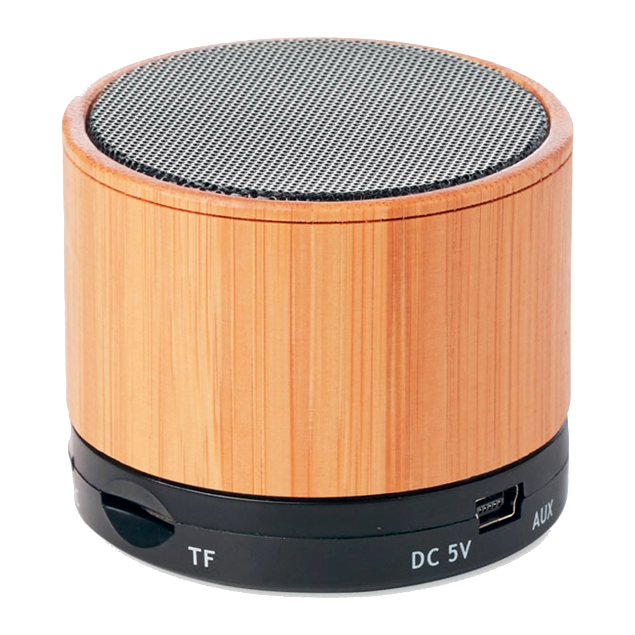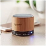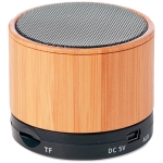 Compacto parlante con cuerpo en bambú/bamboo y conexión Bluetooth® con 3W de potencia, función manos libres y base antideslizante.