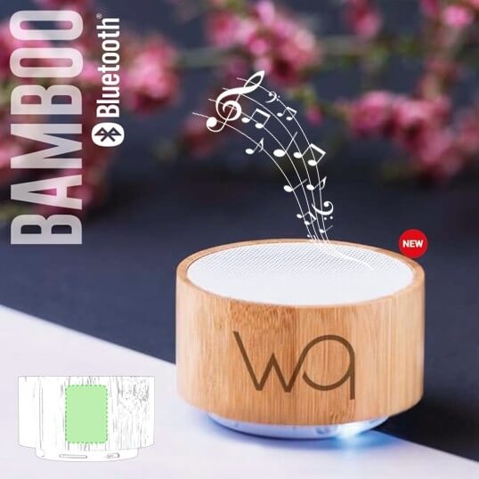 Altavoz inalámbrico con conexión Bluetooth® y 3W potencia. Con carcasa en bambú natural en combinación recubrimiento superior de algodón. De tamaño compacto y con práctica asa de transporte en algodón. Batería de litio de 300mAh, con cable de carga Tipo C incluido. Presentado*Valor para 50 unidades. (Pedido mínimo) Incluye impresión de logo 1 color. *valor neto+ IVA