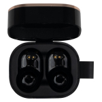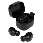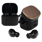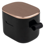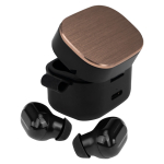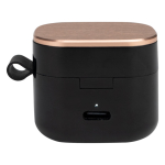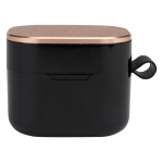Audífonos auriculares inalámbricos en contenedor de plástico ABS color negro con tapa metálica encobrizada, función Bluetooth Touch ID, puerto Tipo-C, emparejamiento automático, incluye par de protectores de silicona y manual de instrucciones en inglés y español. Presentación en estuche de cartulina KRAFT negra. Producto amigable con el medio ambiente.