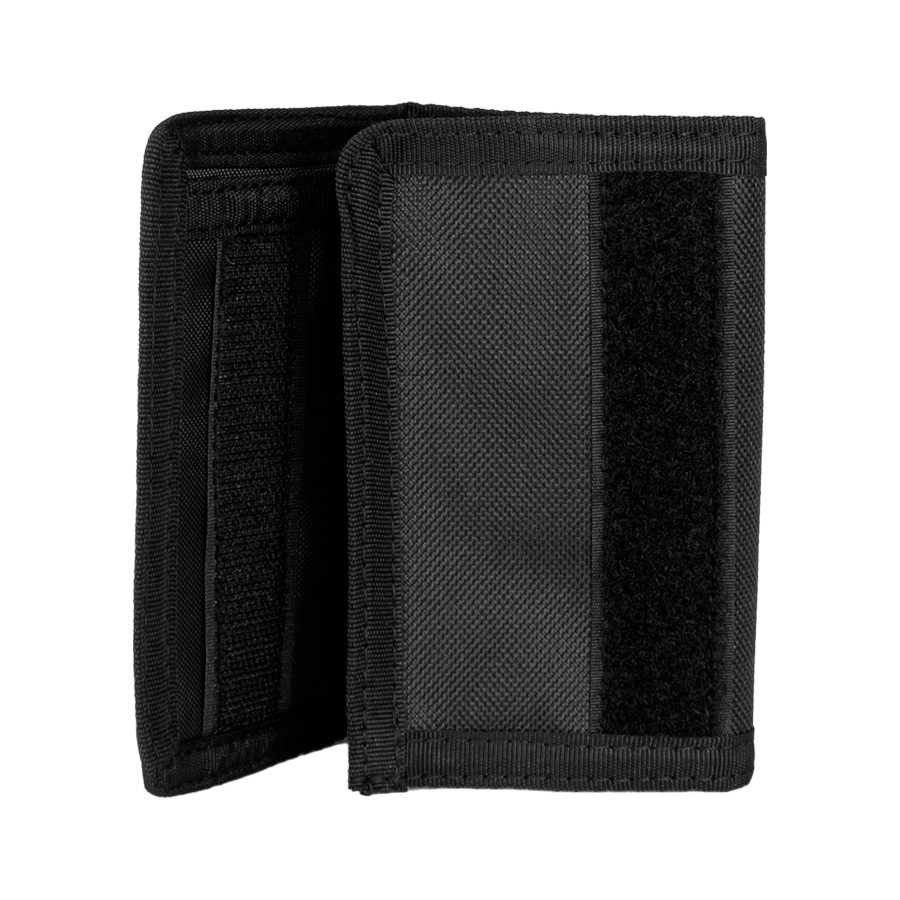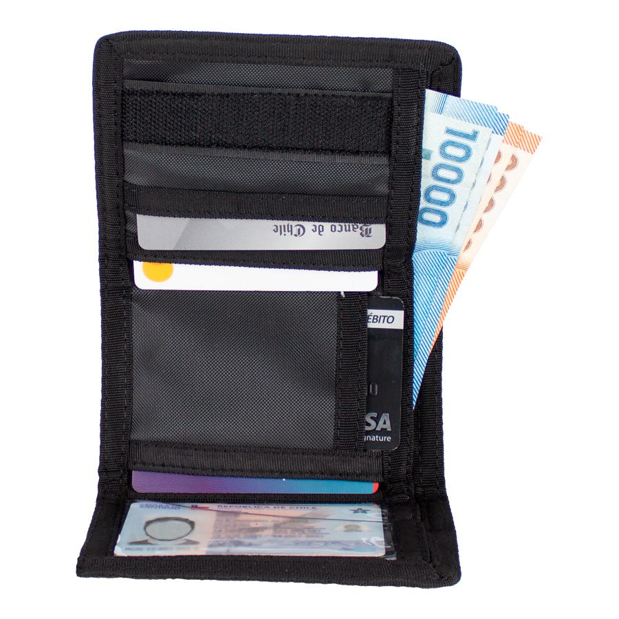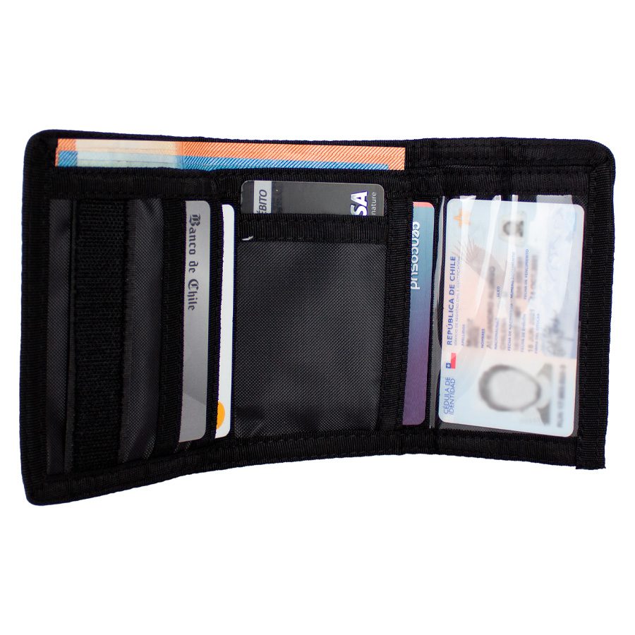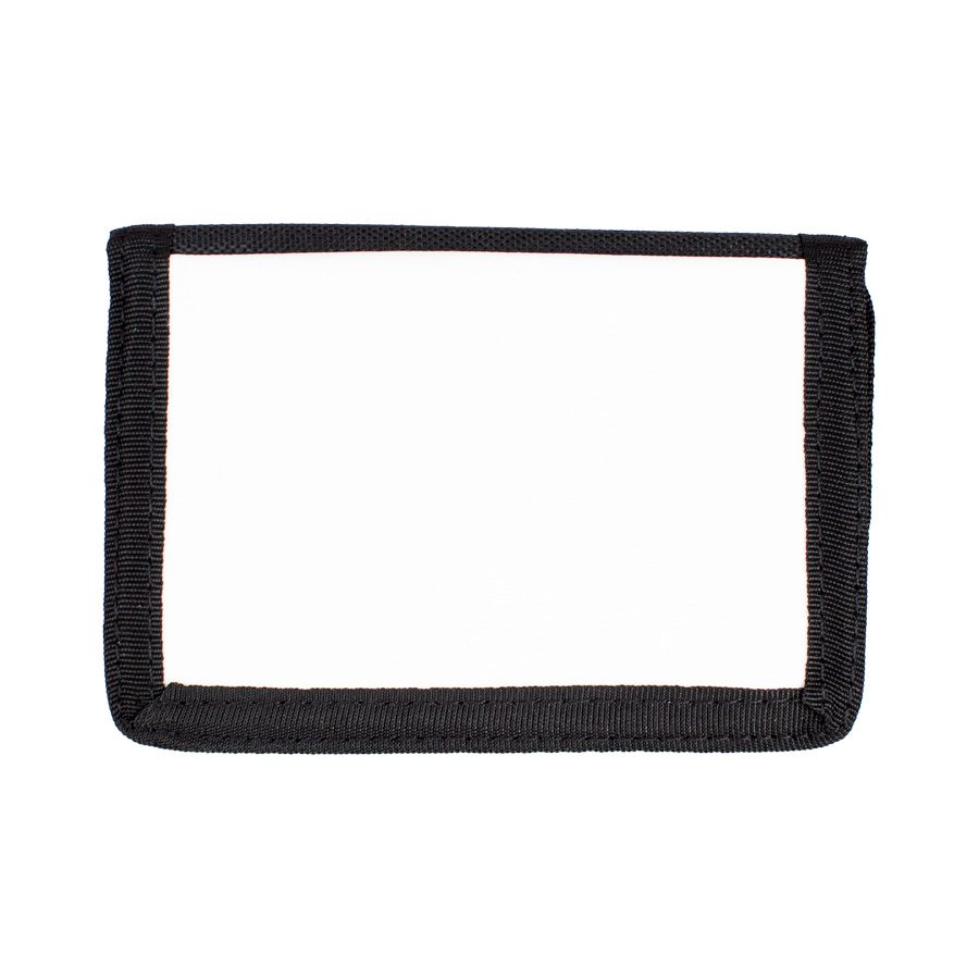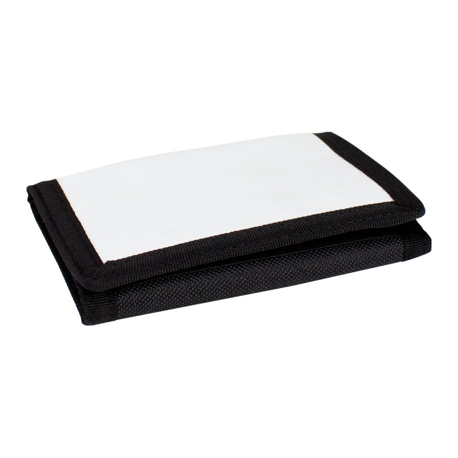 Billetera de nylon y poliéster color negro, con ventana de nylon blanco de 10.2 x 6.8 cm, para Sublimación. Presentación en bolsa PP translúcido. Tamaño: 12.3 x 8.3 x 1.5 cm. aprox.