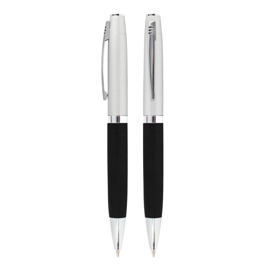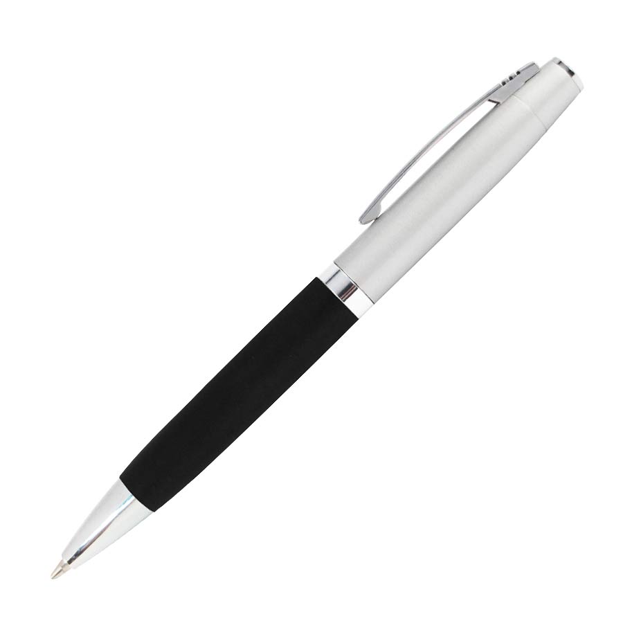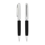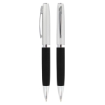 Bolígrafo Metálico bicolor modelo “Chairman”. Cuerpo inferior superficie engomada negra, cuerpo superior plata satinado, terminales cromados. Escritura negra.