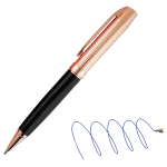 Bolígrafo metálico electro plateado en color cobre y negro de finas terminaciones. Acabado brillante. Escritura azul.
