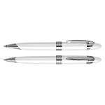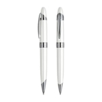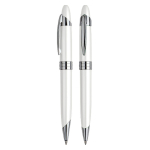 Bolígrafo metálico modelo “White Pearl”, con terminales cromados plata. Escritura azul.