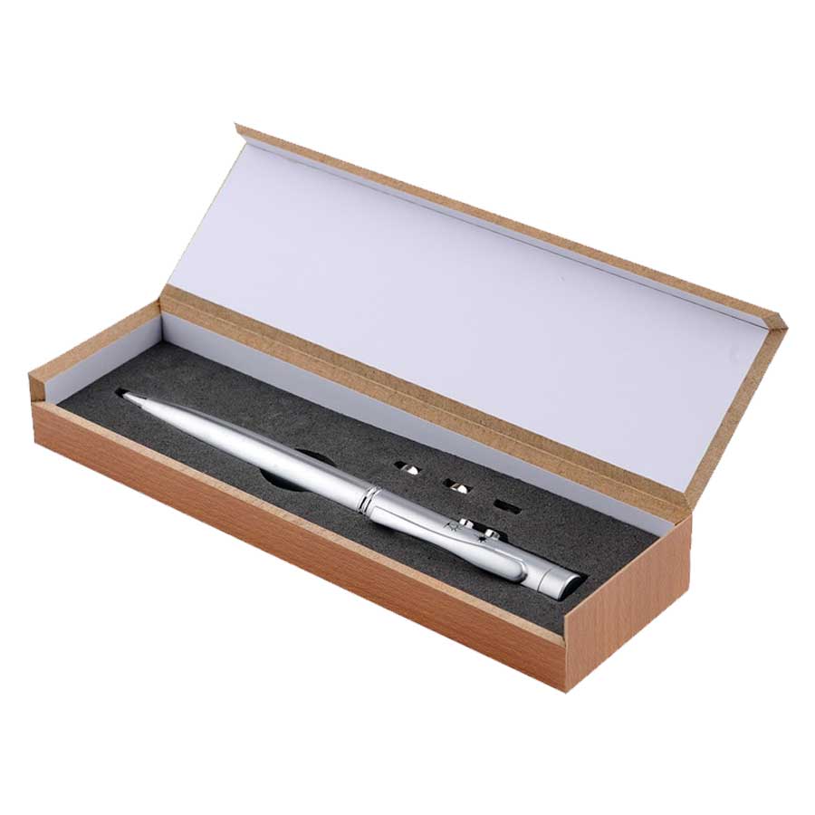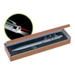Bolígrafo metálico multi-función 3 en 1. Incluye bolígrafo, linterna LED y puntero láser. Presentación en estuche de madera.