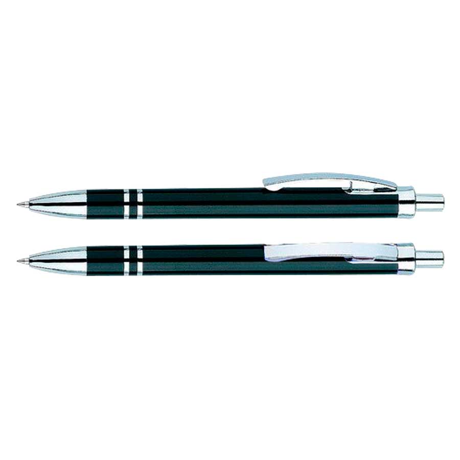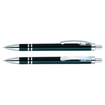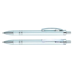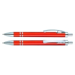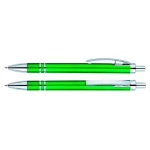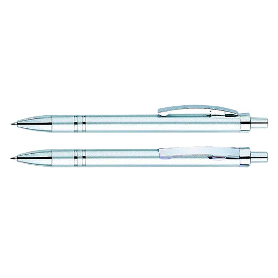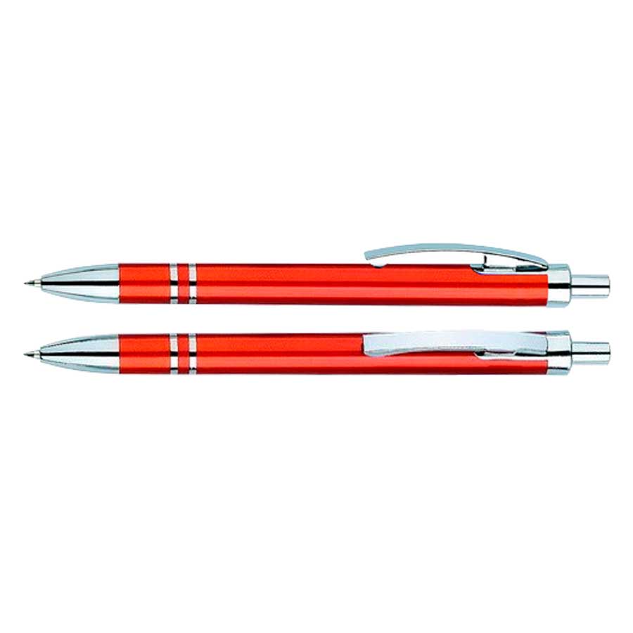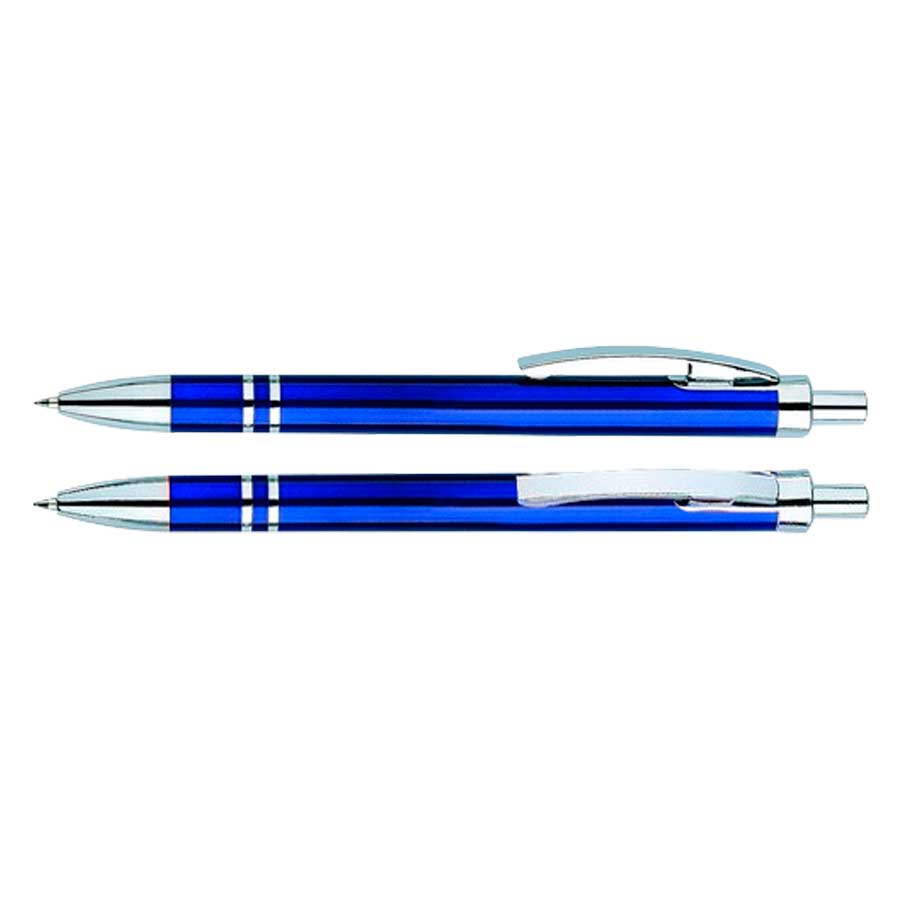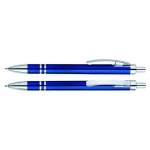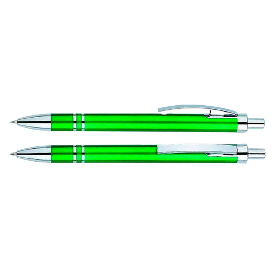Bolígrafo plástico “Arco” con cuerpo de color metalizado. Escritura azul.