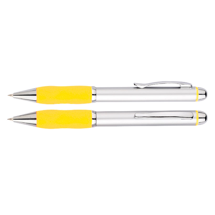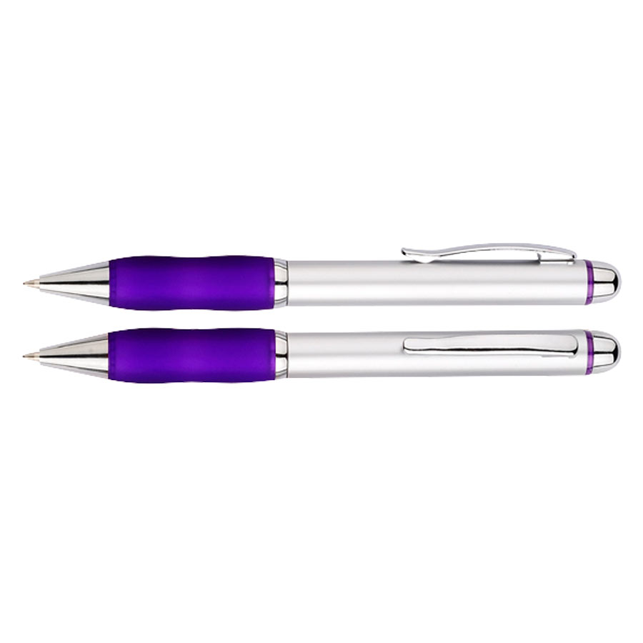 Bolígrafo plástico metalizado «Qasar» con goma de color. Escritura azul.