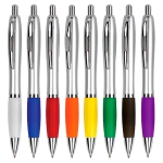 Bolígrafo plástico plateado con goma de color, modelo “Wind Satin”. Escritura Azul. El Bolígrafo más famoso del mundo.