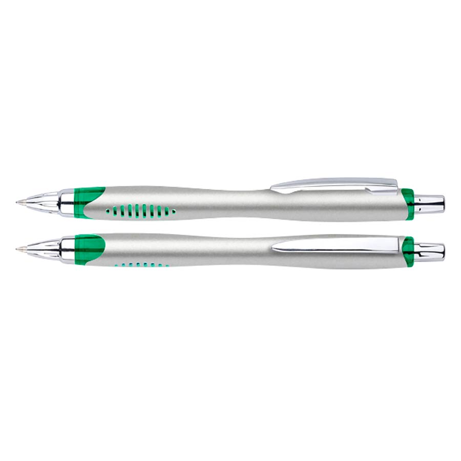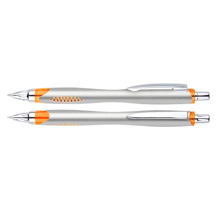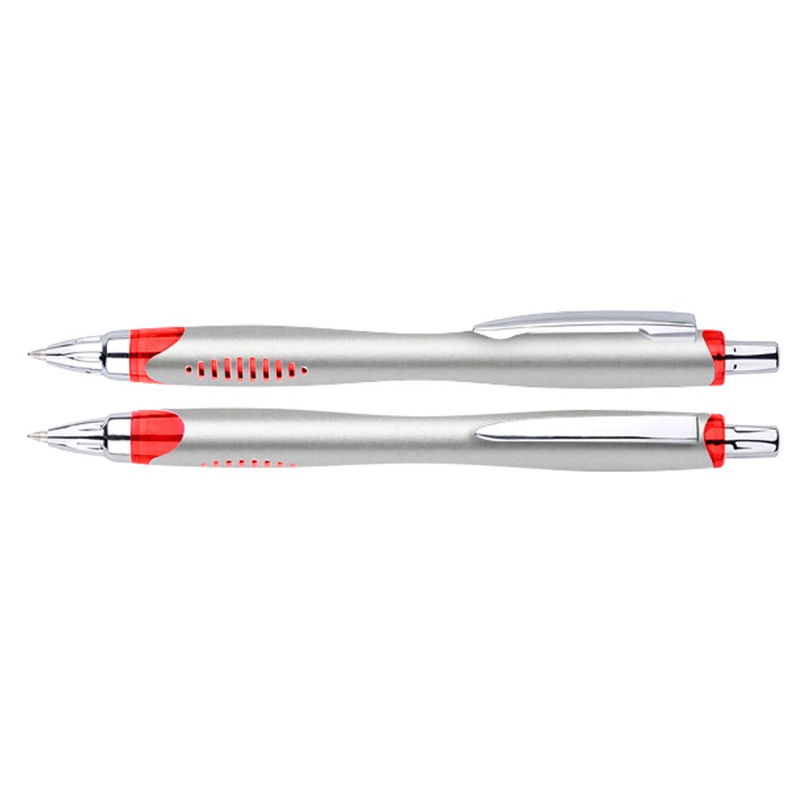 Bolígrafo plástico "Arco" con cuerpo de color metalizado. Escritura azul.
