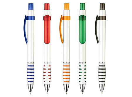 Bolígrafo plástico “Qasar” con cuerpo de color metalizado. Escritura azul.
