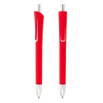Bolígrafo plástico con cuerpo de color mate y terminales plateados. Escritura azul.