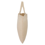 Bolsa de Yute modelo "Shangri-La", con recubrimiento laminado interior. Fuelle de yute. Manillas de cordón acolchado de yute de 40 x 1.5 cm. aprox. c/u. 39x36x15 cm.La bolsa de yute con manillas acolchadas y laminado es un excelente regalo promocional por su resistencia, durabilidad y carácter ecológico, ideal para compras o uso diario, que ofrece una imagen rústica y natural a la marca, siendo muy práctica para transportar productos medianos y más pesados que las bolsas de plástico, además de ser personalizable para branding, reforzando un mensaje de sostenibilidad a clientes y colaboradores. El yute es una fibra natural, biodegradable, lo que alinea la marca con prácticas responsables y ecológicas, un valor muy apreciado actualmente.