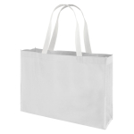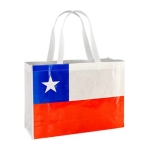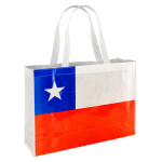 Bolsa reutilizable de Tela No Tejida (TNT) de 80 g/m2. Incluye gráfica termolaminada de Bandera chilena por el anverso y por el reverso es 100% blanca, ideal para impresión de logo. Cuenta con 2 asas de 60cm. c/u aprox.40x30x12.