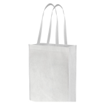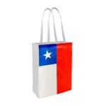 Bolsa reutilizable de Tela No Tejida (TNT) de 80 g/m2. Incluye gráfica termolaminada de Bandera chilena por el anverso y por el reverso es 100% blanca, ideal para impresión de logo. Cuenta con 2 asas de 60cm. c/u aprox.30x40x12.