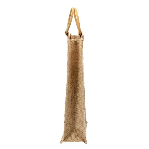 Bolsa de Yute modelo "Biosfera", con recubrimiento laminado interior. Fuelle de yute. Parte superior reforzada con doble tela yute y manillas troqueladas.40 x 36 x 15 cm aprox / Manillas troqueladas de 9 x 3 cm aprox c/u.La bolsa de yute reforzada con asas troqueladas es un regalo promocional altamente efectivo porque combina sostenibilidad (material natural, biodegradable) y calidad/durabilidad (asa reforzada para cargas pesadas), ofreciendo alta visibilidad para la marca en el día a día y eventos, ideal para un mensaje ecológico y premium, usándose en compras, merchandising, embalaje de productos gourmet o cosméticos naturales, y reflejando compromiso ambiental. Posiciona la marca como ecológica y responsable con el medio ambiente, usando un material natural, biodegradable y reutilizable.
