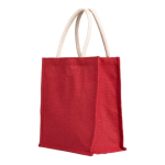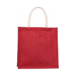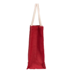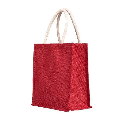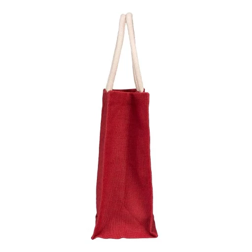 Bolsa reutilizable hecha con fibras de yute en color rojo. Tamaño ideal para compras diarias gracias a su fuelle y manillas gruesas de algodón. Las fibras de yute entregan resistencia y durabilidad además de una presentación rústica, llamativa y natural.33x33x15.