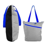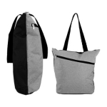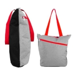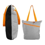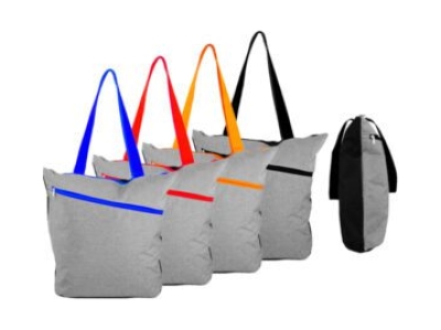 Bolso de compra modelo “Oxford”, en tela Poliéster 300D/PVC gris jaspeado, mangos y cierres de color. Incluye bolsillo delantero. Reverso negro en tela poliéster 600D. 38 x 40 x 12 cm. aprox.
