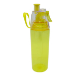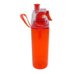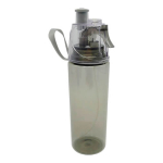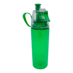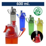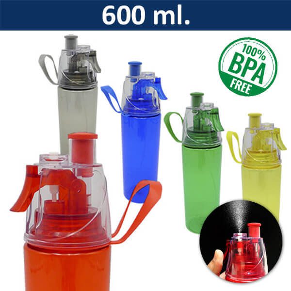 Botella con rociador en distintos colores. Boquilla y asa en color gris. Asa removible. Capacidad de 600 ml. Presentación en bolsa plástica. Libre de BPA.